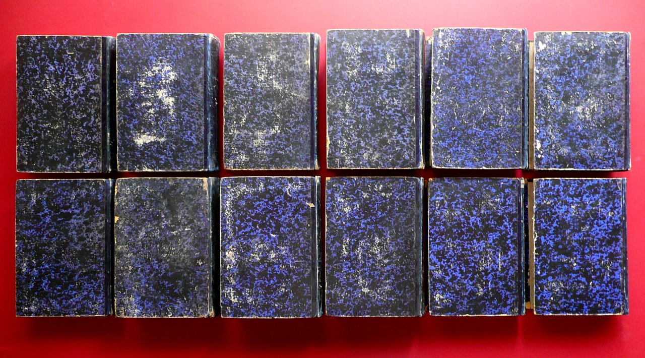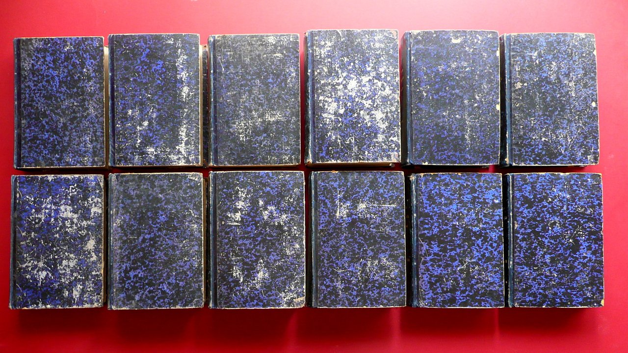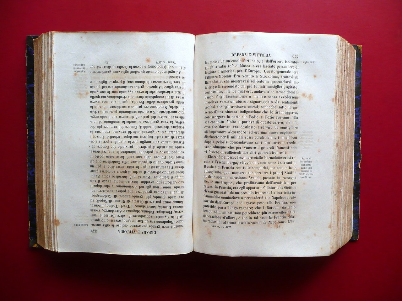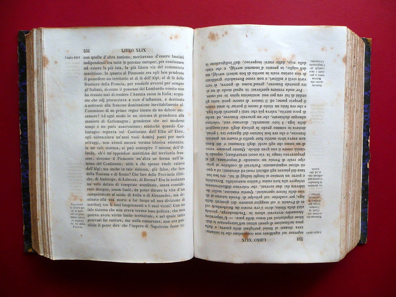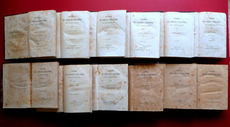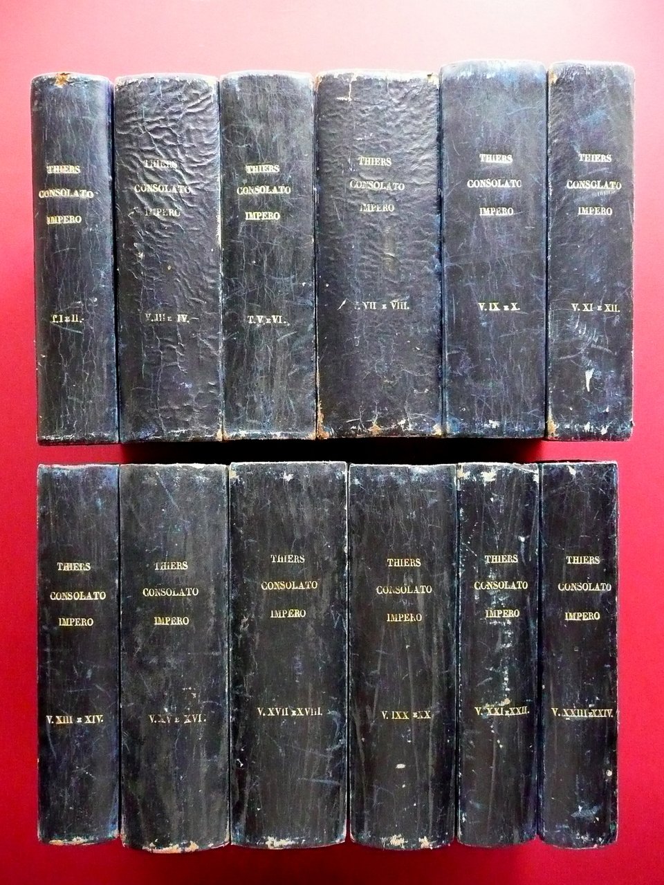 Adolfo Thiers, † Storia del Consolato e dell'Impero di Napoleone opera di Adolfo Thiers prima traduzione italiana - Opera completa suddivisa in 24 tomi rilegati entro 12 volumi Tip. Elvetica - Cerutti - Unione Tipografica Editrice;Capolago - Torino 1845-1862; cm 21,5x14,5; pp. 396 (tomo I); pp. 371 (tomo II); pp. 477 (tomo III); pp. 519 (tomo IV); pp. 401 (tomo V); pp. 494 (tomo VI); pp. 603 (tomo VII); pp. 624 (tomo VIII); pp. 550 (tomo IX); pp. 422 (tomo X); pp. 410 (tomo XI); pp. XXXV-370 (tomo XII); pp. 435 (tomo XIII); pp. 323 (tomo XIV); pp. 633 (tomo XV); pp. 375 (tomo XVI); pp. 544 (tomo XVII); pp. 506 (tomo XVIII); pp. 641 (tomo XIX); pp. 372 (tomo XX); pp. 451 (tomo XXI); pp. 381 (tomo XXII); pp. 502 (tomo XXIII); pp. 256 (tomo XXIV); legatura d'epoca in mezza pelle con titolo impresso in oro al dorso. Opera completa in 24 tomi rilegati entro 12 volumi. † Condizioni di conservazione Volumi tutti complessivamente in buono stato con tracce d'uso, coperte con alcune abrasioni, graffietti e poche piccole mancanze principalmente ai margini dei piatti e al dorso. Interni buoni con alcune bruniture; angolo sup. delle pp. del tomo XI con lievi tracce di vecchia ammaccatura. Pagine 337-352 del tomo XVII rilegate al contrario e in verso opposto a quello della lettura, ma tomo completo (vedi foto); pp. 633-636 del tomo XIX staccate dal corpo del testo, volume peraltro ben saldo e compatto; alcune pagine dei tomi XIX-XXIV lievemente / minimamente ingiallite a causa dell'et‡ e del tipo di carta. † Rara e monumentale opera completa del Thiers, in 24 tomi rilegati entro 12 volumi. Prima edizione italiana, che ebbe diversi stampatori, uscita nello stesso anno di quella francese ma che, a differenza di quest'ultima, non prevedeva illustrazioni.† † SETT6.L19103 N