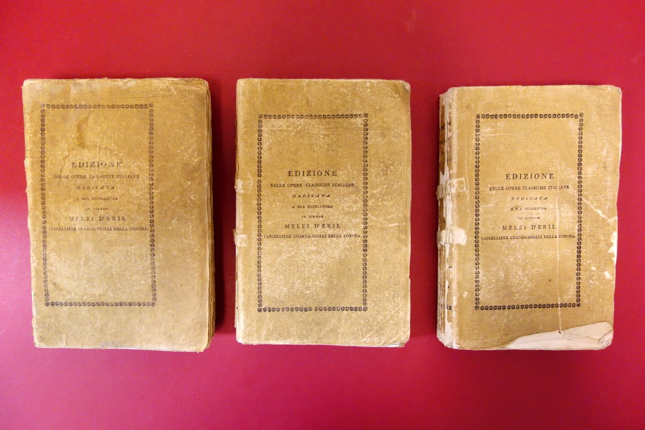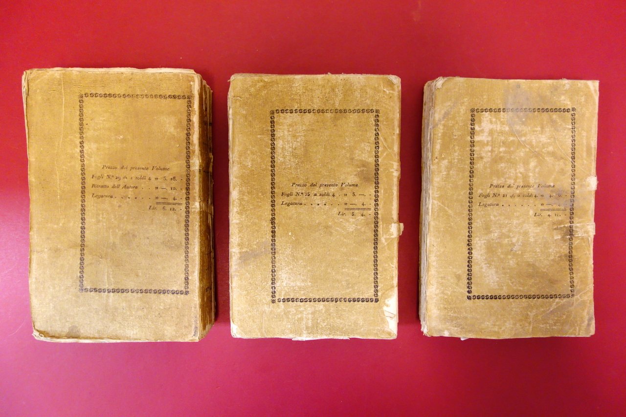Soc. Tip. dei Classici Italiani, Milano, 1805; cm 21x14; pp. [2]-XLIV-426-[2], con un ritratto calcografico dell'autore all'antiporta (vol. 1); pp. 397-[3] (vol. 2); pp. 344-[2] (vol. 3); legatura ed. d'attesa. Opera completa in tre volumi.