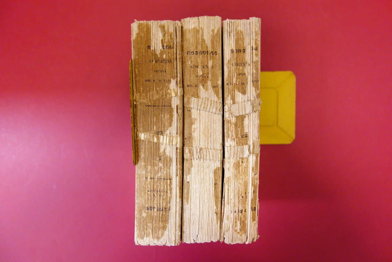 Tutti e tre i volumi complessivamente in buone condizioni con tracce d'uso e leggeri segni del tempo; legature d'attesa con alcune leggere abrasioni, piccole / minime marginali mancanze; dorsi con fessurazioni e mancanze, con conseguente leggero allentamento delle cuciture; dorsi dei voll. 2 e 3 con rinforzo cartaceo d'epoca. Brossura ant. e pp. 1-96 del volume 3 staccate dal corpo del testo. Interni buoni, interessati da leggero foxing e da qualche marginale ombra di gora le quali non comportano perdite o danni al testo.