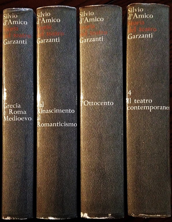 Milano, Garzanti, 1968. 4°, quattro volumi, legature editoriali, sovracoperte. Volume 1 Grecia e Roma - Medioevo, pp. VIII,282, illustrazioni nel testo e 185 fuori testo di cui 15 a colori; Volume 2 Dal Rinascimento al Romanticismo, pp. 394, illustrazioni nel testo e 222 fuori testo di cui 20 a colori; Volume 3 - Ottocento, pp. 376, illustrazioni nel testo e 309 fuori testo di cui 20 a colori; Volume 4 - Il teatro contemporaneo, pp. 373, illustrazioni nel testo e 308 fuori testo di cui 18 a colori. Piccoli difetti al margine inferiore del dorso delle sovracoperte, bella copia.