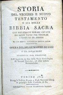 In-8°, pp. XXIV, 623, leg. d'epoca p. pergamena. Tagli rossi a spruzzo. All'occhietto, una vignetta silografica a p. pag. Fioriture. Prima traduzione italiana delle 'Figures de la Bible' (Parigi, 1670). L'opera, la cui attribuzione oscillò tra Nicolas Fontaine e il Lemaistre de Saci (e ascritta poi comunemente al primo) desume una serie di riflessioni morali da episodi estrapolati dalI'Antico e dal Nuovo Testamento. In fine, cronologia dei pontefici e della storia ecclesiastica. Il foglio del titolo attribuisce erroneamente l'opera al Lemaistre de Saci. Secondo molti studiosi, tra cui il Brunet, probabilmente con maggiore veridicità, autore della presente opera, conosciuta correntemente con il titolo di 'Royaumont', sarebbe Nicolas Fontaine (Parigi, 1625-1709), scrittore ecclesiastico gravitante nella cerchia di Port Royal e, in conseguenza di ciò, incarcerato alla Bastiglia tra il 1664 e il 1668. Il Lemaistre de Saci (Saci è l'anagramma d'Isac), nato a Parigi nel 1613 e morto nel 1684 a Pomponne, fratello cadetto di Antoine, direttore delle religiose e dei solitari dell'abbazia giansenista di Port-Royal des Champs, scontò anch'egli per accusa di giansenismo due anni di prigionia alla Bastiglia, durante i quali si dedicò alla traduzione della Bibbia. Rese in francese anche poeti pagani, l'Imitazione di Cristo' e i 'Sermoni' agostiniani. Brunet, IV, 1433-34: 'Cet ouvrage, qui depuis près de deux siècles jouit d'unsuccès soutenu, a été attribué à Le Maitre de Sacy: mais il est plutôt de Nic(olas). Fontaine'. Graesse,VI, 181 (ribadisce, senza aggiungere altro, il parere del Brunet).