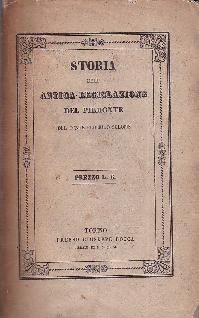 In-8° (225x140mm), pp. XXXI, 489, (3), brossura editoriale con titolo entro bordura. Restauri al dorso. Qualche usuale fioritura. In barbe. Edizione originale di questo importante studio di storia giuridica piemontese. Capitoli sugli ordini di governo pubblico nell'Italia occidentale del XIII secolo, sulle leggi politiche, sugli statuti comunali, sulla procedura nei giudizi civili, sulle leggi civili,sulle leggi criminali, sulle leggi feudali, sulle leggi ecclesiastiche. Lo Sclopis (Torino, 1798-ivi, 1878) fu uomo di stato e poligrafo, autore di numerose opere letterarie e storiografiche. Ministro di Giustizia nel 1848, nel 1849 divenne Senatore e, nel 1853, Presidente della Regia Deputazione sopra gli studii di storia patria. Nel 1863-'64 presiedette il Senato e, nel 1872, il ginevrino Congresso degli Arbitri per la questione dell'Alabama. Presiedette altresì la torinese Accademia delle Scienze. Manno, I, 2770. Manca al Lozzi.