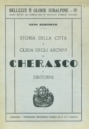 In-8°, pp. 188, brossura editoriale con piccola vignetta. Una veduta di Cherasco a p. pag. da un'antica stampa. Testatine figurate. 10 tavv. in b.n. f.t. Ottimo stato. Indice: Cenni storici sulla città di Cherasco; Storia e Guida del Museo-Archivio Adriani; Storia e Guida dell'Archivio Comunale; Storia delle Chiese e Guida degli Archivi Ecclesiastici; Storia e Guida degli Archivi degli Enti Laici. Bellezze e Glorie Subalpine, IV.