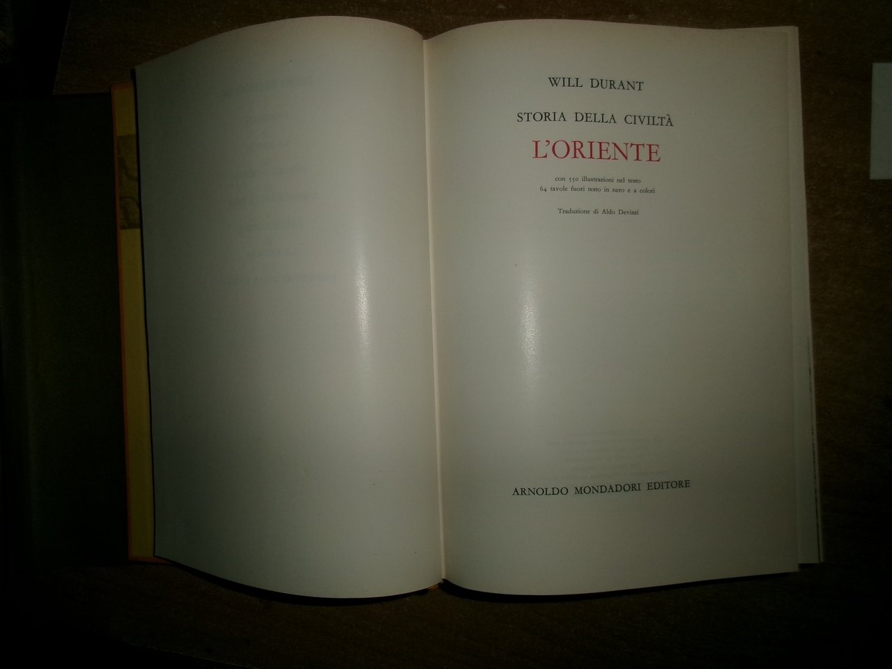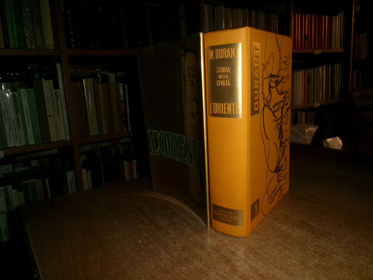 WILL DURANT. Milano, Arnoldo Mondadori, 1964. Storia della Civiltà. L' ORIENTE. In-8°, tela edit. illustrata con sovracopertina a colori. XII, 1033 pp. con 550 illustrazioni nel testo, 64 tavole fuori testo in nero e a colori. Ottimo stato. Uff. C - II - 6
