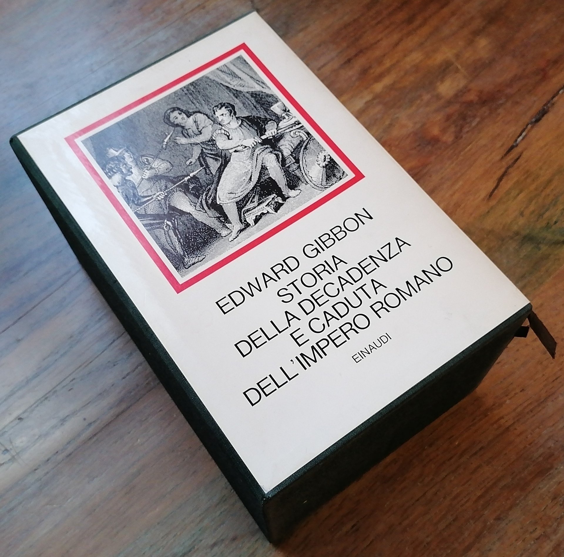 (Roma - Storia antica) Tre volumi in 8°, legatura editoriale in piena tela con sovraccoperte e custodia illustrate a colori, taglio di testa colorato, segnalibro in tessuto, pp. complessive XXXVIII,IX,(1), X,2915,(3), con 3 cartine ripiegate tratte dall'edizione originale del 1781 e 28 tavole a colori fuori testo. Traduzione di Giuseppe Frizzi. Con un saggio di Arnaldo Momigliano. Collana "I millenni", finito di stampare il 14 ottobre 1967. Piccolo ex libris a timbro, di critico d'arte bolognese, al piede del frontespizio in ogni volume. Stato di conservazione molto buono.