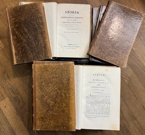 27 volumi in 8 (cm 14,5 x 23), alcuni volumi in numerazione continua, altri con numerazione autonoma. Solida legatura in mezza pelle con titolo e filetti oro ai dorsi. Bell'esemplare di questo classico della storia letteraria italiana nell'edizione di Venezia stampata dal 1823 al 1825. L'ultimo volume comprende la Vita di Girolamo Tiraboschi scritta da Pier Alessandro Paravia e gli Indici. La prima edizione fu stampata a Modena nel 1772-82, con le ristampe di Firenze, Napoli, Roma. La seconda, stampata a Modena, e' del 1787-94, cui seguirono quelle di Venezia (1795-96), Firenze (1805-1813) e Milano (1822-26) fino a questa di Venezia iniziata nel 1823. L'opera di Tiraboschi, archivio sontuoso delle lettere d'Italia dai Romani al Settecento, prende le mosse dalla Storia della letteratura veneziana di M. Foscarini e dagli Scrittori d'Italia di Mazzuchelli e canonizza nella storiografia letteraria la periodizzazione per secoli. Deve la sua fortuna alla immensa mole di notizie e di fonti, tutte scrupolosamente vagliate dall'autore.