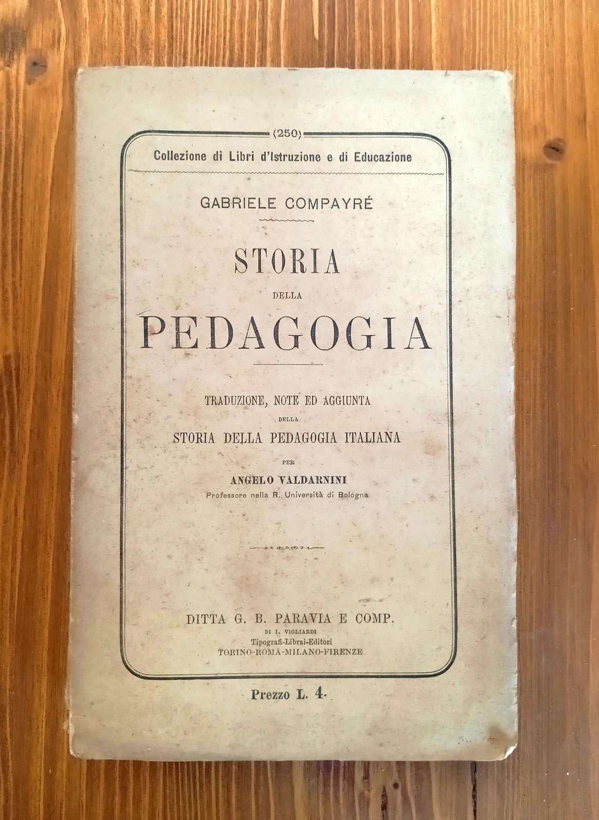 Collezione di libri d'Istruzione e di Educazione - Brossura editoriale a stampa, 542 pagine. Traduzione, note ed aggiunta della Storia della Pedagogia Italiana per Angelo Valdarnini. Normali segni del tempo, complessivamente in ottimo stato con legature ben salde.
