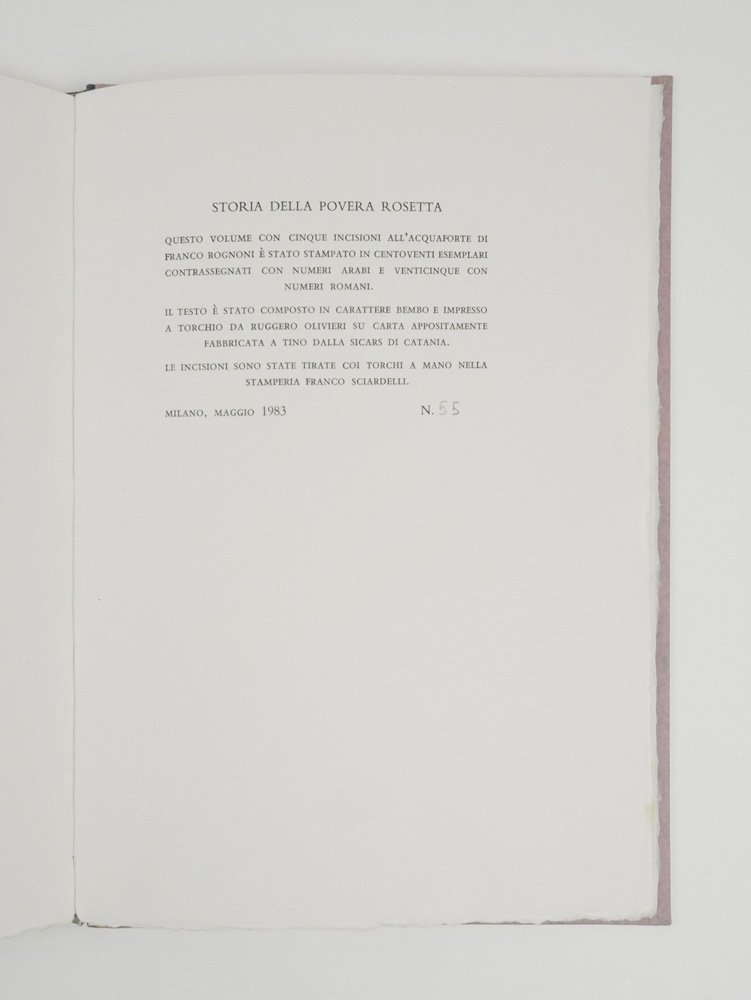 - pp. [2] 37 [13]; 5 incisioni di Franco Rognoni nel testo firmate a matita; una grande testatina e un finalino.