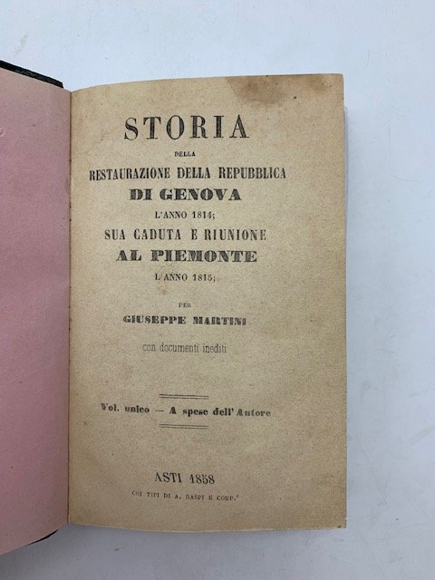 In 16 (cm 10 x 15), pp. 319 + (1 bianca). Gora agli ultimi 4 fogli. Legatura coeva in mezza pelle. Edizione originale, rara, di questa storia dell'effimera restaurazione della Repubblica genovese, caldeggiata dall'Autore, poi sconfessata dalle potenze vincitrici, che decretarono la riunione della Liguria al Piemonte nel 1815. Giuseppe Martini nacque a Ceriana, presso Sanremo, il 2 luglio 1801. Ebbe vita travagliatissima a causa della diserzione dall'esercito sardo e di un'accusa che gli costo' la prigionia e da cui fu piu' tardi scagionato. Visse a Roma e a Napoli per circa vent'anni. Si trasferi' quindi a Torino. Mori' nel 1864. "Storico meritevole di studio, fin'ora obliato perche' critico nei confronti della monarchia sabauda" scrisse Giuseppe Pitre' ("Carteggio", vol. I, 1861-1869, 2000, p. 90).