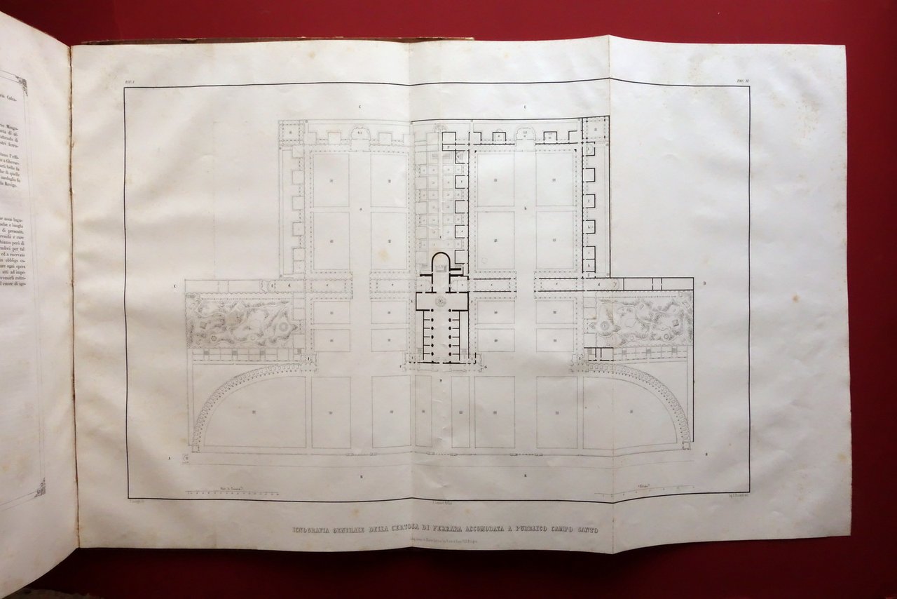 Stabilimento A. Minelli, Rovigo 1851; cm 60x47; pp. X-78 con XVIII (18) belle tavole litografiche a piena pagina, alcune ripiegate anche più volte (F. Galuppi dis. - F. Canonici Archit. - Ing. E. Riccardi inc.), più una bella tavola litografica non numerata - panorama dell'antica Certosa di Ferrara rip. più volte (G. Pividor dis.); doppio frontespizio con belle inc. in b/n. Legatura d'epoca in mezza pelle con fregi impressi in oro al dorso, piatti marmorizzati.