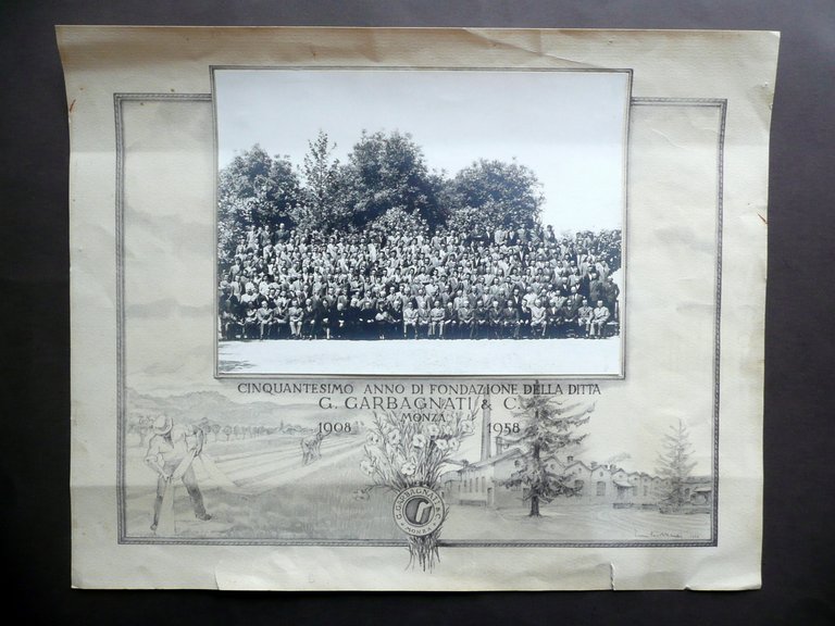Modulo -Diploma Cinquantesimo anno di Fondazione della ditta G. Garbagnati & C." 1908-1958 Monza Modulo - diploma,1958, cm. 33x41, fotografia in b. e n. applicata di cm 18x24. Condizioni di conservazione Esemplare in buono stato, tracce d'uso, supporto con qualche minuscola brunitura, lievi tracce di pieghette, margine inf. con un paio di piccole tracce di sporco. Bel Modulo - Diploma firmato con stabilimento e uomini al lavoro nei campi. Bella fotografia originale applicata centralmente con l'insieme di tutti i dipendenti. SC03.D1712 F "