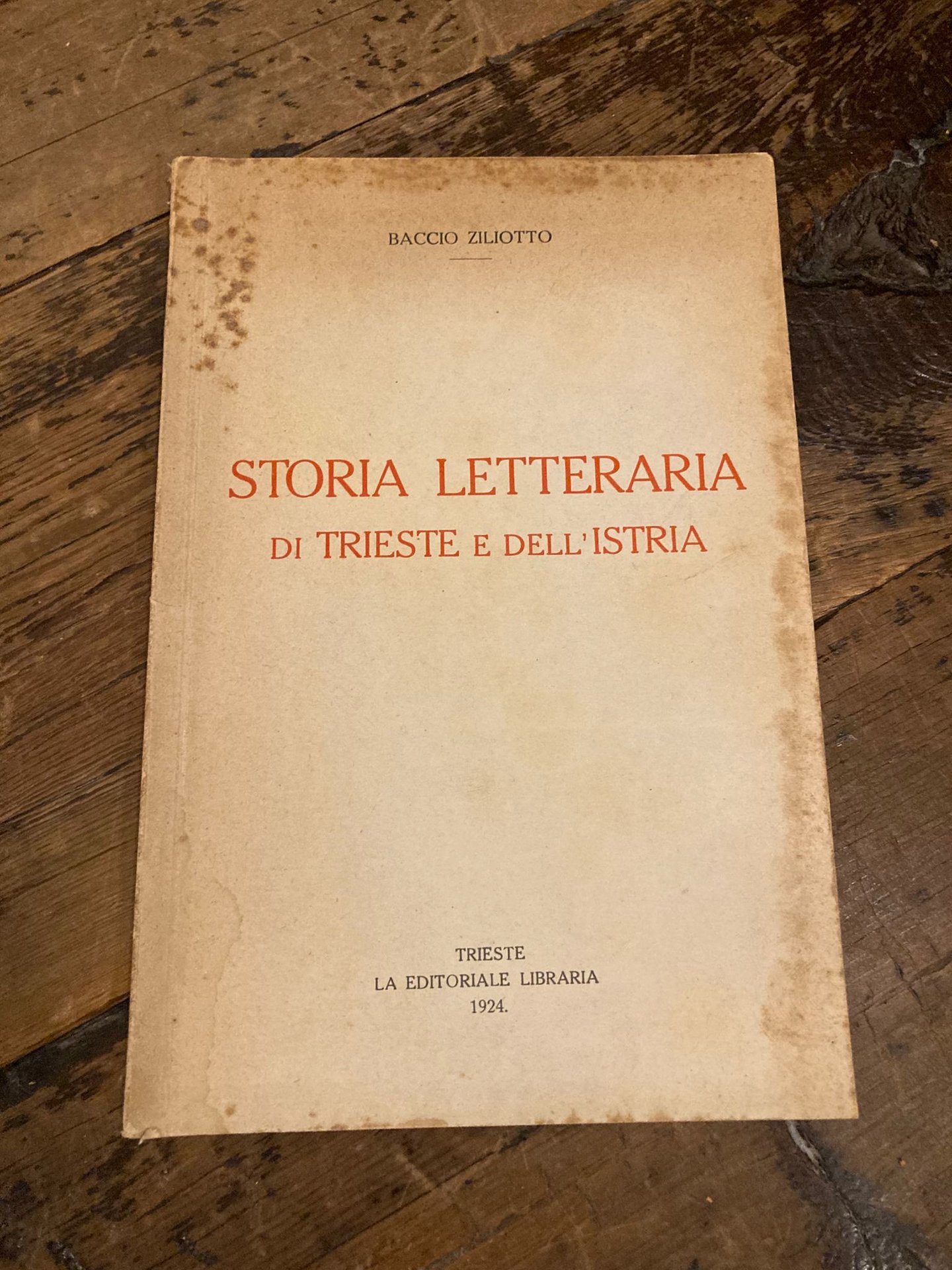 In-16° (18x13 cm), pp. 99 (1). brossura editoriale con titoli in rosso e nero. Minimi difetti al piatto anteriore ma più che buon esemplare. Edizione originale di questa storia della letteratura triestina e istriana dai primordi fino ai primi del Novecento.