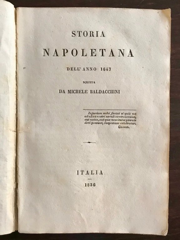 In-16° (cm. 17), brossura muta coeva con titolo a stampa su tassello e invio autografo dell'autore al letterato Camillo Ugoni (piccolo strappo al piede del dorso); pp. [4] 162 [4] in ottimo stato, in barbe. Edizione apparsa due anni dopo l'originale, narra della rivoluzione di Masaniello. Ottimo esemplare. (SC1)
