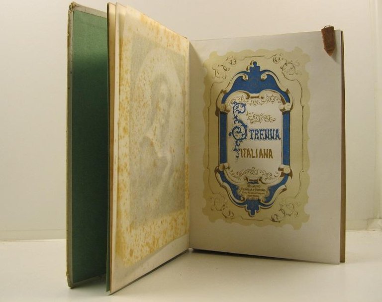 In 8, pp. 230 + (2) con 4 ritratti incisi n.t. Diffuse fioriture alle carte. Qualche danno al dorso. Bella legatura romantica in cartonat. con fregi in rilievi bianchi e oro e vignetta incisa ai piatti raff. una fanciulla discinta che volteggia suonando il tamburello mentre tiene con l'altra mano una piccola capretta che saltella. Front. stampato in cromolitografia. Ricca cornice tipografica alle pagine. Testi di: Tullio Dandolo, Cesare Rovida, Giuseppe Gazzino (che traduce in siciliano un poemetto bernesco di Giovanni Meli), Antonio Zoncada, e vari scritti femminili firmati 'una Ticinese, una donna milanese, Emilia F., Guglielmina L., Giuseppina N.).