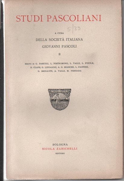 Studi Pascoliani. a cura della Società Italiana Giovanni Pascoli II . Scritti di G. Pascoli - L. Pietrobono - l. Valli- L. Fucile - D. Claps - G. Lipparini - A. G. Bianchi - G. Briganti - A. Valli - M. Ferrara.