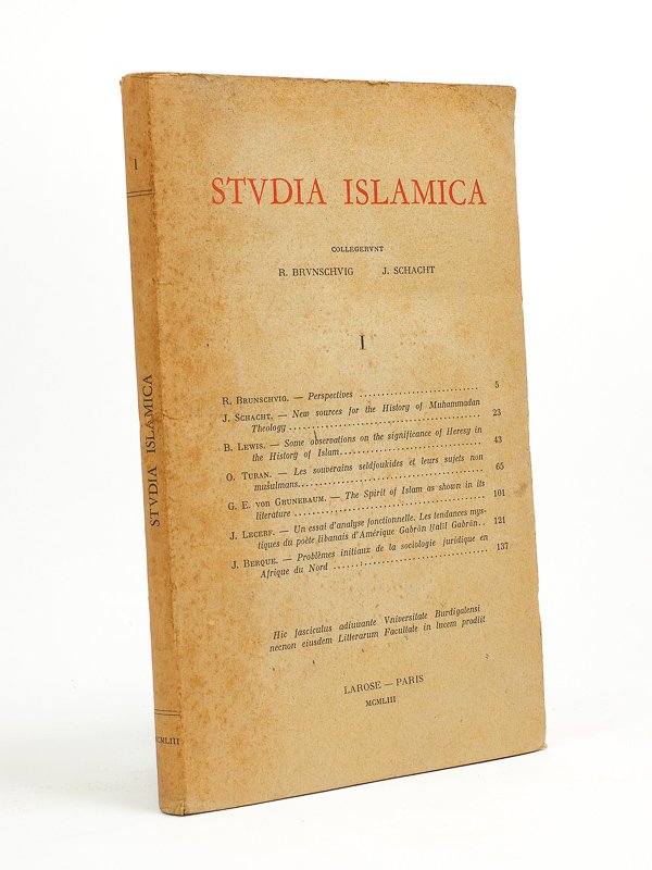 1 vol. 12mo. softcover, Larose, Paris, MCMLIII ( 1953), 162 pp. Table of contents : Perspectives (R. Brunschvig) ; New sources for the History of Muhammadan Theology (J. Schacht) ; Some observations on the significance of Heresy in the history of Islam (R. Lewis) ; Les souverains seljoukides et leurs sujets non-musulmans (O. turan) ; The Spirit of Islam as shown in its literature (G. E. von Grunebaum) ; Un essai d'analyse fonctionnelle. Les tendances mystiques du poète libanais d'Amérique Gabran Halil Gabran (J. Lecerf) ; Problèmes initiaux de la sociologie juridique en Afrique du Nord (J. Berque). Very nice copy of this very fist issue of Studia Islamica. This reviews aimed at offering to a wider public, and not only to specialists of Islam, papers on all sections of islamic studies. Text were written either in English or French.