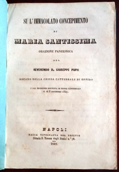 Su l'immacolato concepimento di Maria Santissima. Orazione panegirica del reverendo G. Pupa, decano della chiesa cattedrale di Oppido. recitata in detta cattedrale il dì 8 dicembre 1847