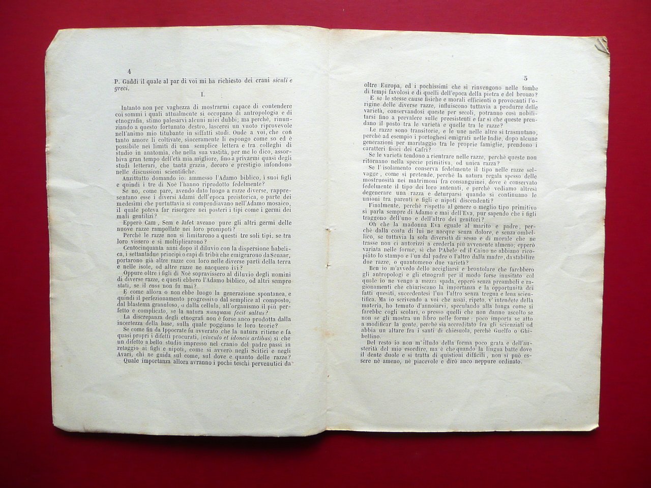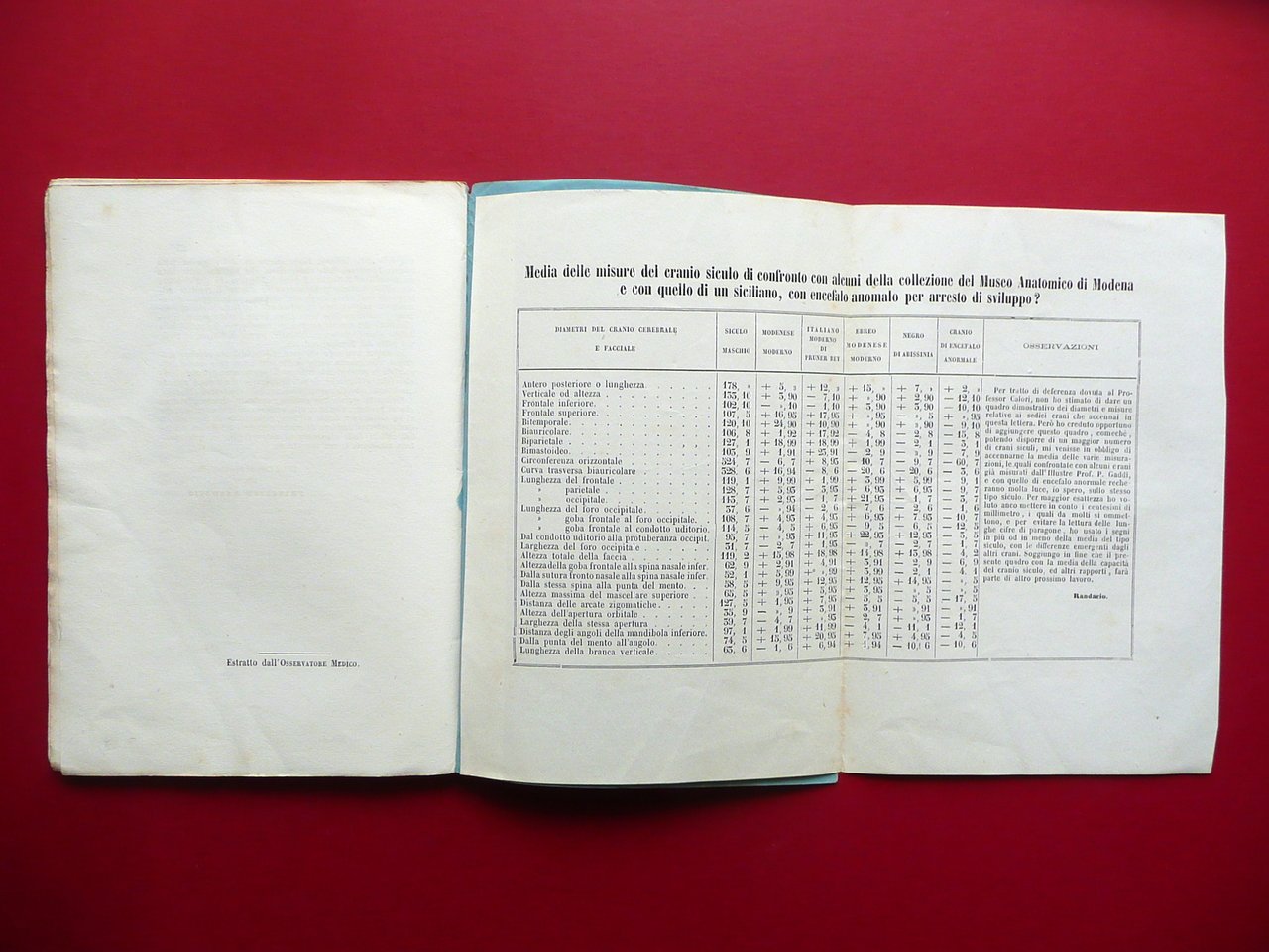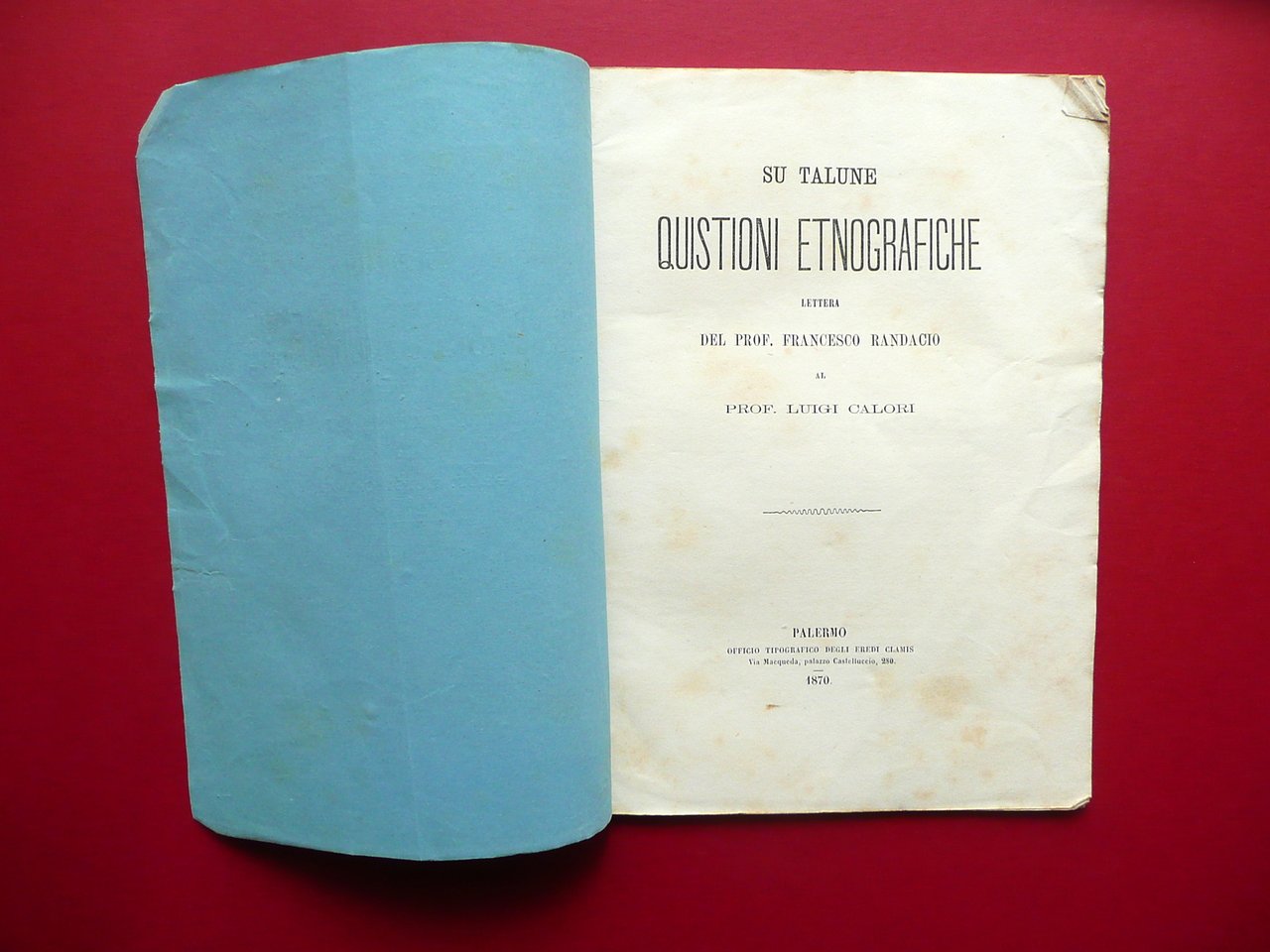 Opuscolo, Su talune quistioni etnografiche lettera del Prof. Francesco Randacio al Prof. Luigi Calori Eredi Clamis, Palermo 1870; cm 21,5x15; pp. 24 pi√π una tabella ripiegata fuori testo; brossura ed. Dedica a penna alla brossura ant. Condizioni di conservazione Esemplare ben conservato con tracce d'uso e piccole leggere bruniture, minima traccia di piega longitudinale, angoli delle brossure e di alcune pagine con minime pieghette. Ricerche e confronti sui crani siculi e greci". OPEB.4902 N "