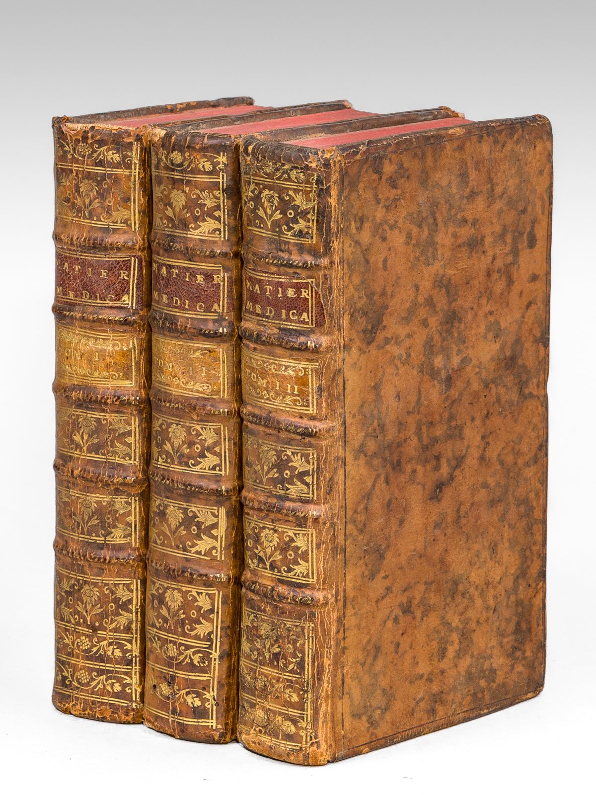 Par Mrs Arnault de Nobleville & Salerne, médecins à Orléans, 3 vol. in-2 reliure de l'époque plein veau marbré, dos à 5 nerfs orné, Chez Desaint & Saillant, G. Cavelier, Le Prieur, Paris, 1756, 2 ff., 604 pp. ; 2 ff., 347 pp., 2 ff., 318 pp. ; 649 pp. et 1 f. Il s'agit des 3 premiers tomes (sur 6) de la "Suite de la Matière Médicale de M. Geoffroy". Etat très satisfaisant (frott. et petits mq. en coiffes et coupes, piq. de vers à un dos en queue, bon état par ailleurs)