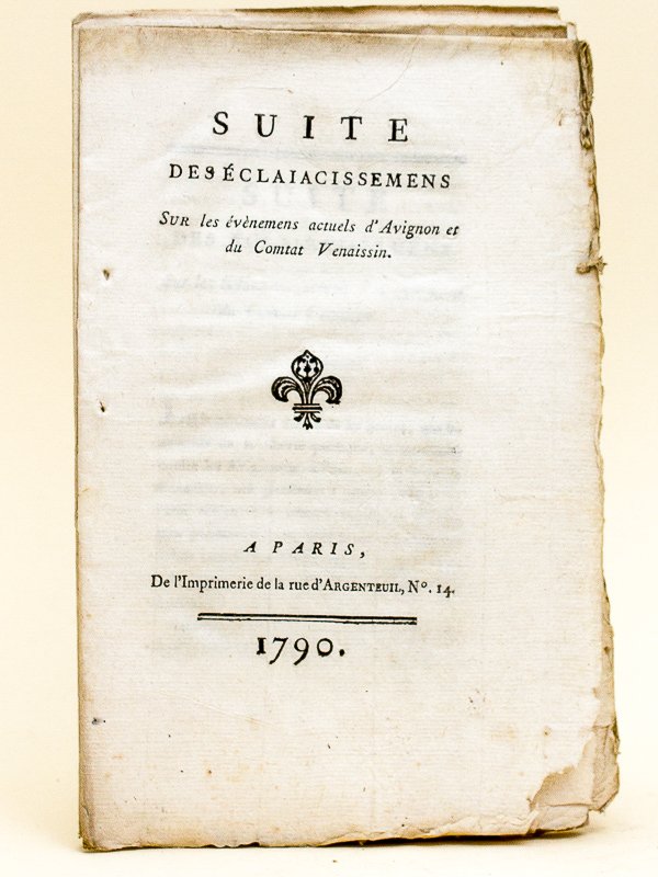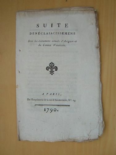 Suite des Eclaiacissemens (sic) [ Eclaircissements ] sur les évènemens actuels d'Avignon et du Comtat Venaissin ; 1 brochure in-8, sans couv., De l'Imprimerie de la rue d'Argenteuil, Paris, 1790, 30 pp. Bon état (en feuillets, anciennes traces de brochage). Peu courant.
