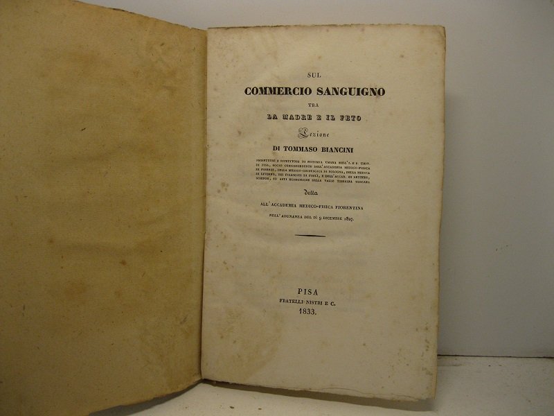 In 8, pp. 84 + (1) + (1b). Errore di numerazione all'ultima c. L'ultima pagina 77 invece che 85. Danni rip. al d. Br. muta. Dall'icipit: 'Io non credo che si trovi in tutte le Memorie dell'anatomica scienza opinione piu' contrastata, e con tutto cio' piu' vera di quella che ammette una reciproca ed immediata circolazione di sangue tra la madre e il feto.'. Biancini istitui' nel 1832 il Museo di Anatomia Umana, con il nome di Gabinetto Anatomico, costruito presso gli Spedali di Santa Chiara a Pisa.