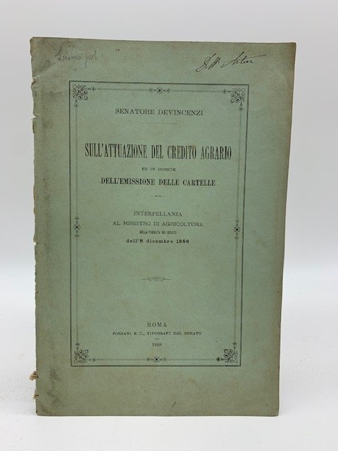 In 8 (cm 14,5 x 22), pp. 33 + (1b). Brossura editoriale. Interpellanza al Ministro dell'agricoltura, fatta dal senatore Giuseppe Devincenzi l'8 dicembre 1888.
