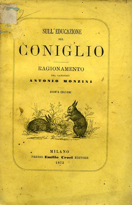 In-16° grande, pp. 158, brossura editoriale con xilografia raffigurante due conigli e titolo a stampa entro filettatura tipografica. Qualche lieve fioritura. Bell'esemplare in barbe. L'autore tratta della storia naturale del coniglio, del coniglio in rapporto alla dietetica e alla culinaria, dell'introduzione del coniglio in Europa, del comportamento di tali animali, dei furetti, delle conigliere e della coniglicoltura, della gestazione del coniglio, della castrazione ed ingrassamento, della vendita dei conigli e delle pelli di coniglio, delle malattie dei conigli, dei modi di cucinare la loro carne e della 'salubrità della carne di coniglio', del coniglio in relazione all'agricoltura e del modo di dare un profumo gradevole alla carne dei conigli domestici. Il canonico Monzini fu autore di alcune altre opere di agricoltura e zootecnia. Ceresoli, p. 368.