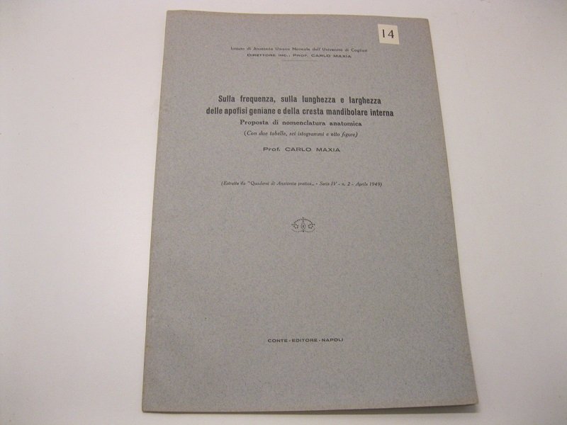 Sulla frequenza, sulla lunghezza e larghezza delle apofisi geniane e della cresta mandibolare interna. Proposta di nomenclatura anatomica. (Con due tabelle, sei istogrammi e otto figure). (Estratto da 'Quad. di An. pratica'-Serie IV- n.2-1949) Istituto di Anatomia Normali dell'Universita' di Cagliari. Direttore inc. Prof. Carlo Maxia