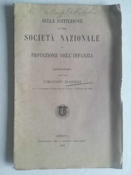 In 16 (cm 13 x 20), pp. 42 + (4) con tabelle + (2) di pubblicita' editoriale. Pagine intonse e ancora chiuse. Bordo esterno verticale dei fogli leggermente sollevato. Brossura editoriale con omaggio autografo al piatto anteriore. Discorso tenuto dall'Autore in occasione del secondo Congresso di pediatria di Napoli dell'ottobre del 1892. Virginio Massini fu medico pediatra capo al Brefotrofio di Genova.