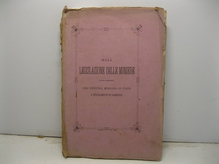 In 8, pp. 99 + (1b) con tavv. sinottiche n.t. Intonso e con pagine chiuse. Danni rip. al d. Qualche mancanza al p. ant. Br. ed. saggio sulla legislazione mineraria con particolare riferimento alla Sardegna.