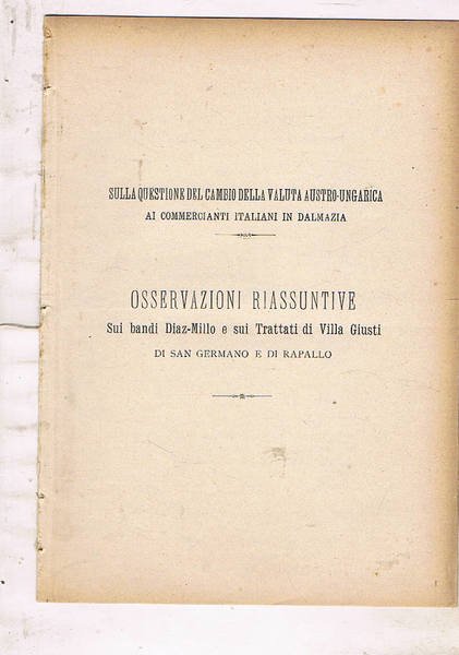 Sulla questione del cambio della valuta austro-ungarica ai commercianti italiani in Dalmazia. Osservazioni riassuntive sui bandi Diaz-Millo e sui Trattatidi Villa Giusti di San Germano e di Rapallo.