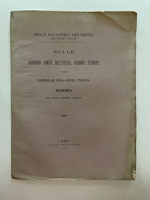 In 4 (cm 22,5 x 30), pp. 17 + (1 bianca). Leggera pieghetta all'angolo superiore del piatto anteriore. Pagine intonse. Brossura editoriale. "L'A. che nel corso felicemente lungo della sua vita assistette a non minori rivoluzioni del mondo filosofico che del sociale e politico, discorre in essa con la puntualita' e la vivezza di testimonio e di parte ad un tempo, descrivendo in iscorcio tutte le mutazioni de' sistemi e de' metodi che si furono succedute dai primi anni del secolo fino al presente in Francia, in Germania, in Inghilterra e segnatamente in Italia. E com'egli ora e' l'unico superstite di quella schiera di valorosi pensatori che nella nostra Penisola ridestarono il culto degli studi razionali con a capo il Galluppi, il Gioberti e il Rosmini, e diederle una filosofia come dire, nativa e non copiatrice de' forestieri. percio' il Mamiani tocca eziandio di se', de' suoi primi scritti, della polemica sostenuta col Rosmini, della determinazione successiva delle sue dottrine filosofiche, e del sussidio prestato insieme con altri suoi dotti amici, a promuovere in Italia una scuola italiana di filosofia di cui fecero banditrice, or fa nove anni, l'attuale Rivista. Ma egli parla di se' medesimo con la sua usata modestia, e in maniera da far dimenticare la propria persona, per mettere al contrario in rilievo i caratteri che, secondo il suo giudicio e il suo studio, dovrebbero appartenere alla moderna scuola italiana, e cioe' d'essere positiva, razionale, e sintetica" ("La filosofia delle scuole italiane. Rivista bimestrale", 1878, p. 285).