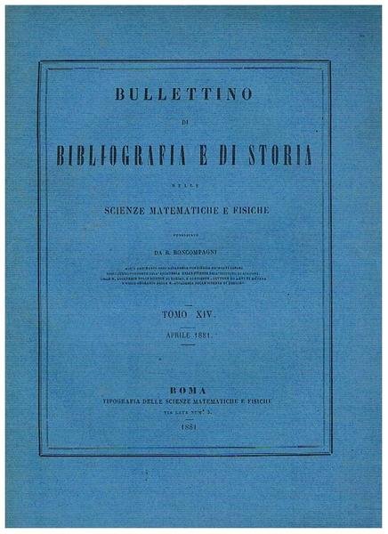 Supplement à la Bibliographie de Gergonne; sull'ottica degli arabi di Wiedemann; annunzi di recenti pubblicazioni. Fasc. di aprile 1881 del bullettino di bibliografia delle scienze matematiche e fisiche.