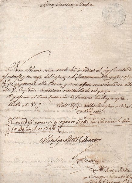 Supplica indirizzata all’Imperatrice Maria Teresa d’Austria a nome del Conte Luigi di Strassoldo al fine ottenere una licenza dall’impiego di almeno tre mesi. Con firma autografa di Antonio Botta Adorno. Datata 29 e 30 dicembre 1763.