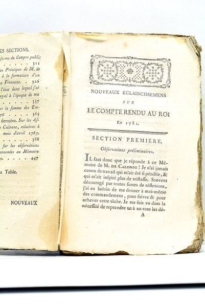 VIII + 455 pages (13x21cm). Couverture muette ancienne. Mouillures aux plats. Déchirures au plat inférieur et à la coiffe. Les derniers feuilllets ont été rongés dans les marges, avec atteinte au texte aux 7 dernières pages. Exemplaire non rogné. Rousseurs. Mouillures. Déchirures dans les marges des deux premiers feuillets. Publié à Lyon en 1788 par G. Regnault, cet ouvrage de Jacques Necker aborde des questions financières cruciales de la France pré-révolutionnaire. En se concentrant sur son rapport au Roi en 1781 et en fournissant de nouveaux éclaircissements, Necker, alors directeur général des finances, engage une réflexion sur la gestion des finances publiques et la critique de son successeur, Calonne. Cette publication intervient dans un contexte de crise financière et de mécontentement social, annonçant les tumultes révolutionnaires.
