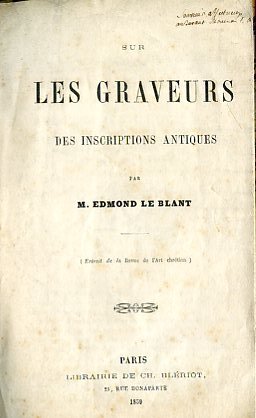 In-8°, pp. 16 + (1) di pubblicità editoriale, bella brossura coeva in marmorizzatura caillouté policroma. Tassello polilobato cartaceo al piatto. Dedica autografa dell'autore al frontespizio. Alla p. 1, un'incisione raffigurante un'iscrizione paleocristiana scoperta nell'Ardèche, a Crussol, nei pressi di Valence. Minime fioriture. Svariate riproduzioni di epigrafi n.t. Ottimo stato. Estratto dalla 'Revue de l'Art Chrétien' del 1859. Interessante contributo allo studio di alcune iscrizioni pagane e paleocristiane; tra le località interessate segnaliamo:Verona, Bevagna, Arles, Roma, Saint Jean de Bournay, Savigliano, ecc. Il Le Blant (Parigi, 1818-ivi, 1897), archeologo e storico, fu, sotto il decisivo influsso giovanile di Giovan Battista De Rossi, grande studioso delle iscrizioni e dell'arte paleocristiane, membro dell'Académie des Inscriptions et Belles Lettres e, dal 1883, direttore dell'École Francaise di Rom.