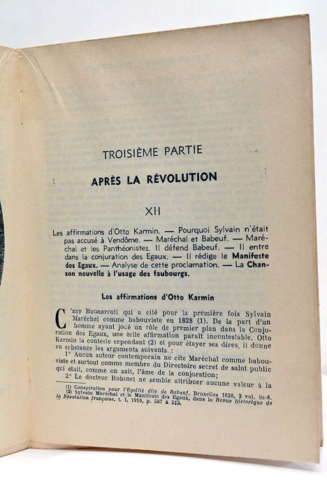 510 pages. 1 feuillet blanc. 3 feuillets. (19x14 Cm). Broché. Couverture imprimée. Taches et rouisseurs. Petits accrocs. Etude sur les oeuvres de Sylvain Maréchal; poète léger, moraliste, érudit, athée, journaliste et dramaturge révolutionnaire, conspirateur communiste plutôt anarchisant, appartenant à la fois au mouvement littéraire, philosophique et social, opposant farouche à toute forme d'autoritarisme. Riche bibliographie signé Maurice Dommanget, enseignant, syndicaliste révolutionnaire, historien de la Révolution française et spécialiste du mouvement ouvrier. Envoi de l'auteur sur la page du faux-titre. Exemplaire en bon état, non coupé. Rares rousseurs et papier un peu bruni.