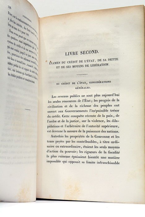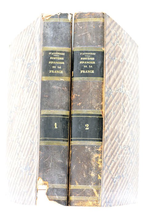 2 volumes. XVI. 450 pages. + XVI. 453 pages. 6 tableaux dépliants. (22x13,5 Cm). Demi-basane. Dos lisses ornés. Coins et coiffes émoussés. Charnières frottées. Manques au dos du premier tome. Dos du 1er tome partiellement décollé. Edition qui fut réimprimé plusieurs fois avec d'importantes additions de cet ouvrage qui est resté le plus connu de l'auteur. Directeur de la Comptabilité Générale des Finances, puis Conseiller d'Etat et président de la Cour des Comptes, le marquis d'Audiffret est à l'origine de la plupart des réformes introduites depuis 1814 dans la comptabilité publique et des simplifications réalisées dans l'organisation des finances. Exemplaire bien complet de ses 6 tableaux dépliants en fin de volume. Fortes rousseurs.