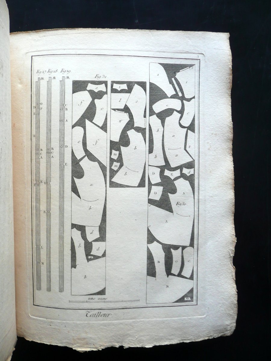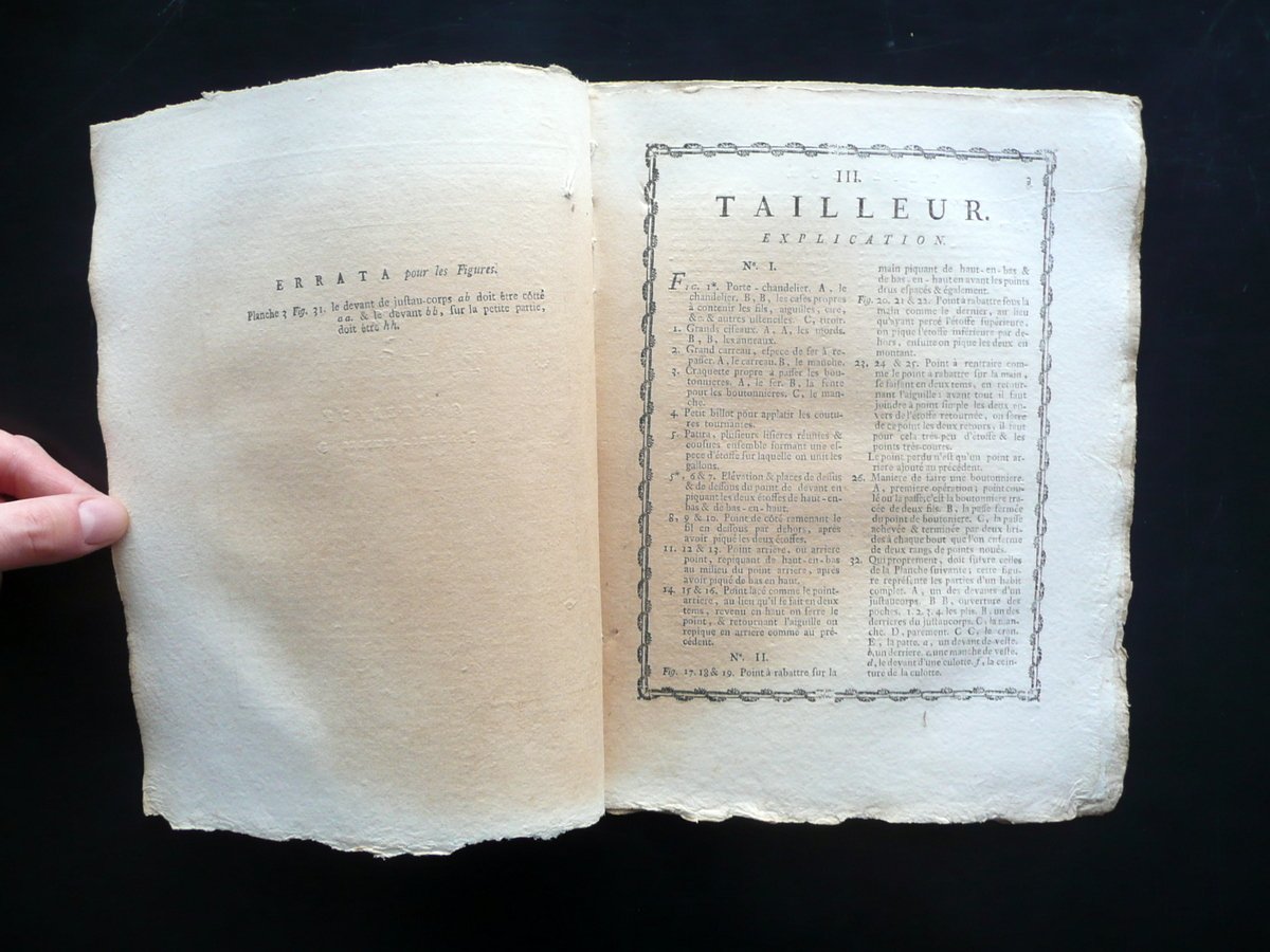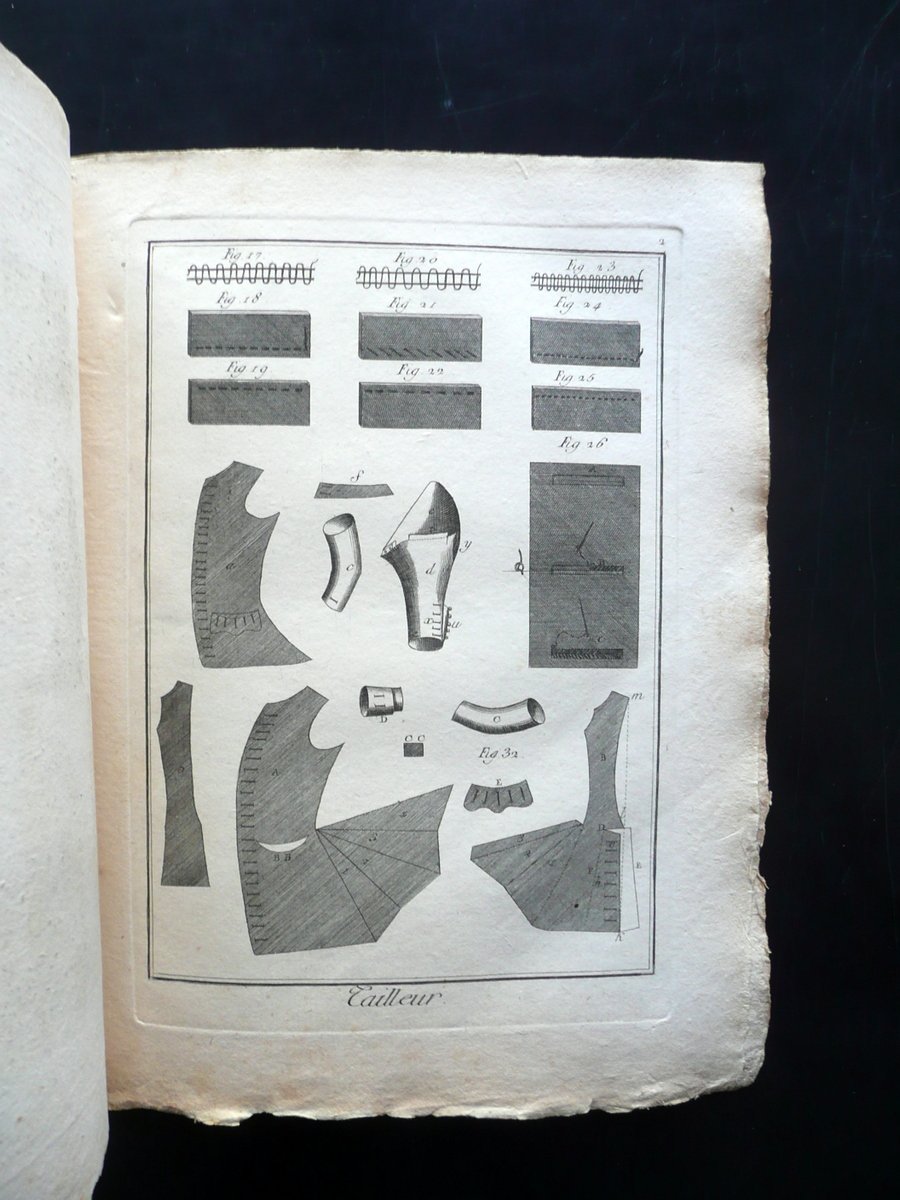 3 tavole, III Tailleur contenant Planches simples 3 Yverdon, 1780; cm 27x21; pp. 4 più 3 belle tavole incise in b/n. Mancanza della legatura ma esemplare compatto. Testo in francese. Condizioni di conservazione Esemplare ben conservato con tracce d'uso, alcune piccole lievi bruniture e leggere ingialliture del tempo; margini con barbe. Mancanza della legatura ma esemplare compatto. 3 tavole. Raccolta di tavole proveniente dall'opera Enciclopedie ou Dictionnnaire Universel Raisonné des Connoissances Humaines, mis en ordre par M. De Felice - Yverdon 1780". SETT176.L15922 N "