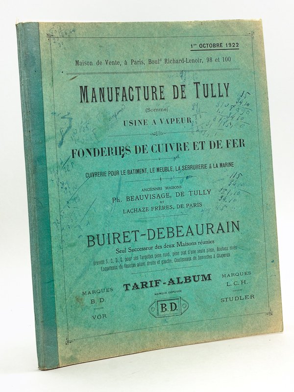 Remis à M. E. Lefranc à Issoudun le 9 mars 1926, 1 vol. in-4 br., B.D., 1922, 50 ff. avec planches en couleurs : Tarif-Album de Buiret-Debeauran Fondeur & Fabricant à Tully par Béthencourt-sur-Mer (Somme) [ Détail du titre : ] Manufacture de Tully (Somme) Usine à Vapeur. Fonderies de Cuivre et de Fer. Cuivrerie pour le Bâtiment, le Meuble, la Serrurerie et la Marine. Anciennes maisons Ph. Beauvisage, de Tully, Lachaze Frères, de Paris. Buiret-Debeauran, seul successeur des deux Maisons réunies. Tarif-Album. Marques B.D. VOR Marques L.C.H. Studler 1er octobre 1922 Etat très satisfaisant (nombreuses annotations sur couv., bon état par ailleurs). Peu commun