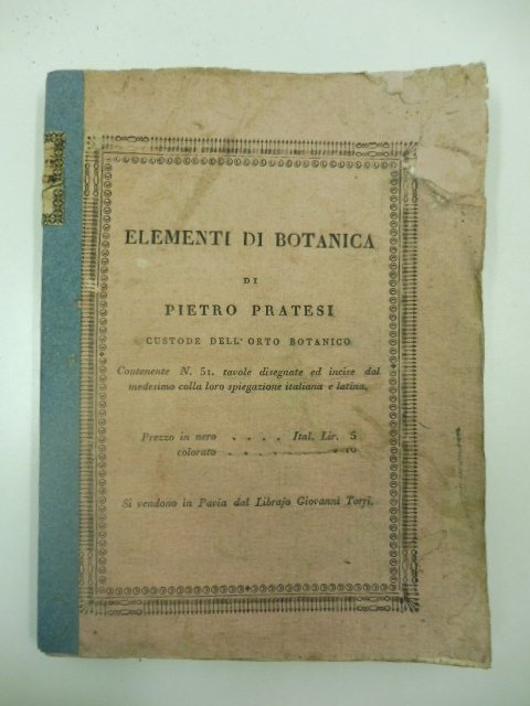 In 16, pp. 34 con 50 tavole fuori testo incise all'acquaforte di cui la prima in apertura della serie con un breve testo dal titolo 'La radice', e 49 tavole raffiguranti foglie, tronchi, gambi. Frontespizio inciso all'acquaforte (per un totale di 51 incisioni. La tavola 14 e' ripetuta per errore (quindi le tavole. effettive sono 52). La brossura editoriale riporta al piatto anteriore questo titolo: Elementi di botanica di Pietro Pratesi custode dell'orto botanico contenente n. 51 tavole disegnate ed incise dal medesimo colla loro spiegazione italiana e latina. L'opera si apre con la spiegazione delle tavole attraverso l'individuazione del nome italiano e del corrispondente latino delle varie parti della pianta. I disegni furono eseguiti dal vero dall'A.