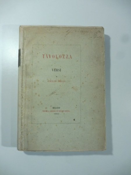 In 8 (cm 24 x 17) pp. (2) + 278 + (2). Cartonatura moderna con brossura editoriale conservata applicata ai piatti. Fresca copia con rade consuete bruniture. Invio autografo al pittore Domenico Morelli, apposto al piatto anteriore della brossura e dedica autografa all'occhietto "Al suo caro amico Domenico Morelli. L'autore". Edizione originale dell'opera prima di uno dei piu' rappresentativi scapigliati lombardi. Morto a 36 anni, anche a causa dei molti vizi coltivati, fu anche tra gli scapigliati colui che maggiormente rapperesento' il "maledettismo". In gioventu', anche grazie alle sostanze del padre, aveva viaggiato, conoscendo le opere di autori come Baudelaire, Hugo, De Musset, Heine. Tavolozza usci' quando il poeta aveva 23 anni e tradisce gia' nel titolo gli interessi che l'autore aveva per la pittura. Nello stile infatti si riconosce un vivo senso del colore di tipo impressionistico mentre nella lingua compaiono termini quotidiani sino ad allora estranei alla lingua poetica. Anche i temi toccati quali orge, incesto, alcolismo contribuiscono al successo dell'opera del giovane autore. Esemplare di grande fascino vista la dedica a Domenico Morelli, con cui il giovane poeta-pittore poteva essere venuto in contatto durante il soggiorno milanese del primo nel 1855.