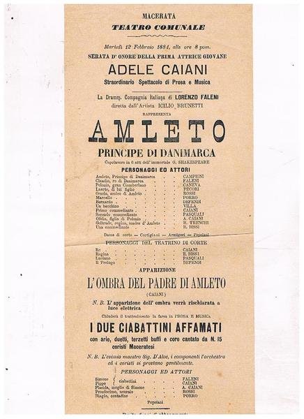Teatro comunale di Macerata. Martedi 12 febbraio 1884, serata d'onore della prima attrice Adele Caiani nello sperracolo di Prosa e musica. Segue la reappresentazione di Amleto della compagnia italiana di Lorenzo Faleni diretta da Icilio Brunetti, seguono atri spettacoli.