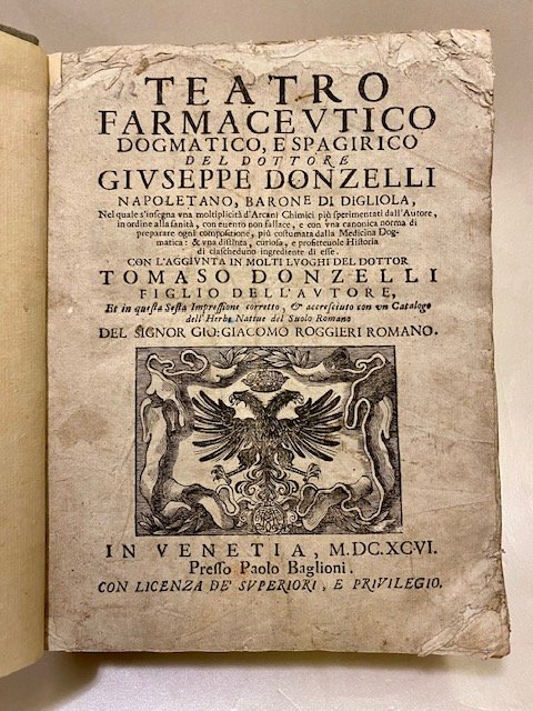 Teatro Farmaceutico Dogmatico, e Spagirico: Con l'aggiunta in molti luoghi del dottor Tomaso Donzelli figlio dell'autore. Et in questa Quinta impressione corretto, & accresciuto con un Catalogo dell'Herbe native del Suolo Romano del signor Gio: Giacomo Roggieri.