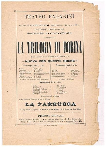 Teatro Paganini. Il 25 febbraio 1891 la drammatica compagnia diretta dall'artista Adolfo Drago rappresenterà la trilogia di Dorina commedia in 3 atti di Gerolamo Rovetta, nuova per queste scene.