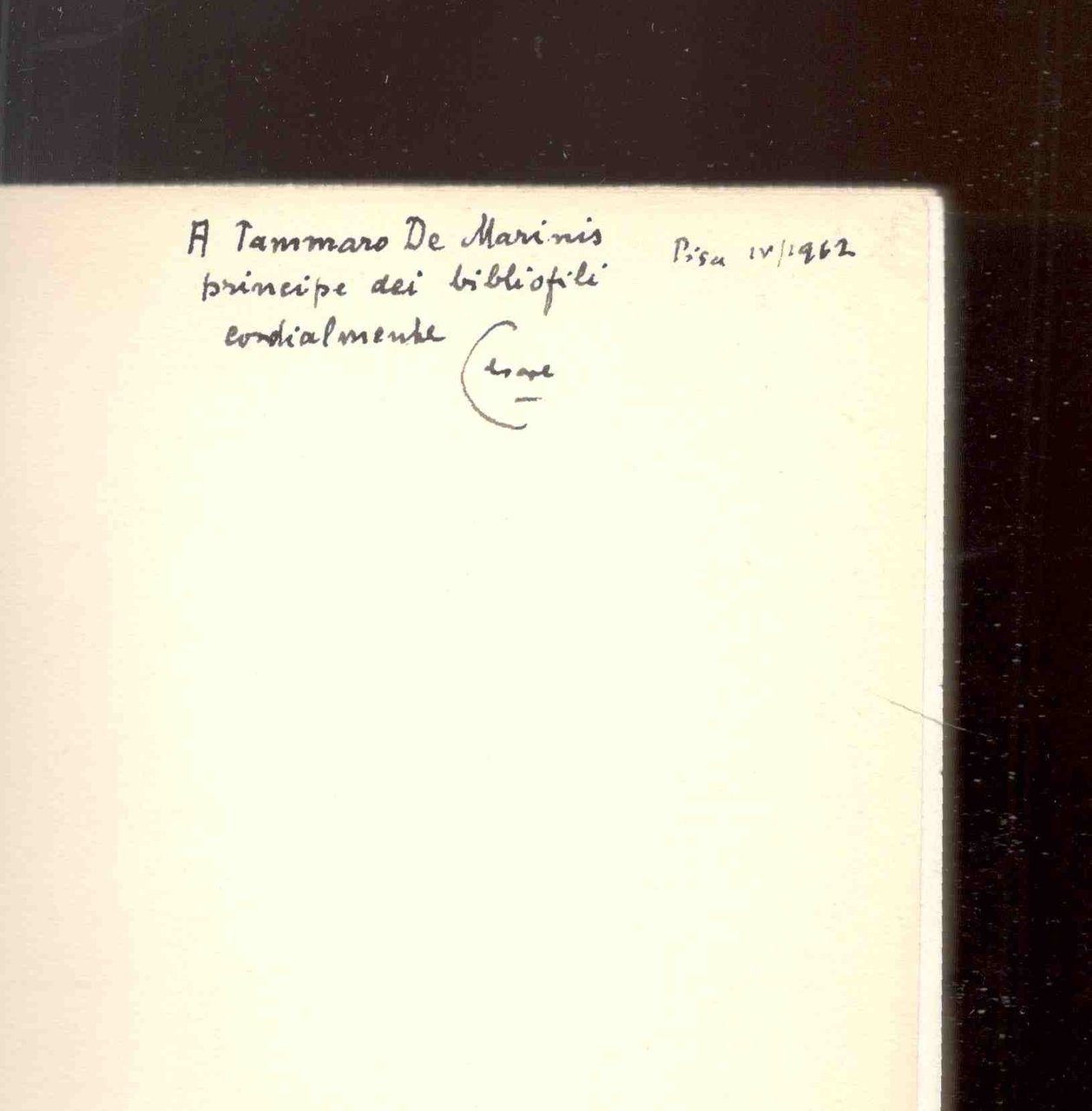 In 8°, pp. 110, (2). Brossura editoriale (qualche segno del tempo). Copia in buono stato, interamente a fogli chiusi. Copia donata dall'autore al celebre bibliofilo Tammaro de Marinis (invio autografo sulla prima carta bianca).