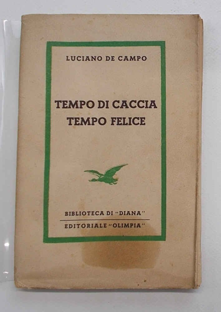 In 16° grande (cm. 19,5 x 13); pagg. 172; con tavole fotograf. f.t,.; leggera carton. originale a due colori e con vignetta. VG-. ** Edizione originale. Crfr. Ceresoli, 207: "Raccolta di 23 bozzetti di cacce nel Veneto". Per l'autore di "narrativa di caccia" dare alle proprie opere un titolo non banale, accattivante, ma non troppo strano è un'impresa di grande difficoltà. De Campo, tra gli altri meriti, ha quello di avere lasciato tre titoli molto riusciti: "Doppietta in spalla" del 1937, questo "Tempo di caccia tempo felice" e "A caccia non s'invecchia", del 1962.