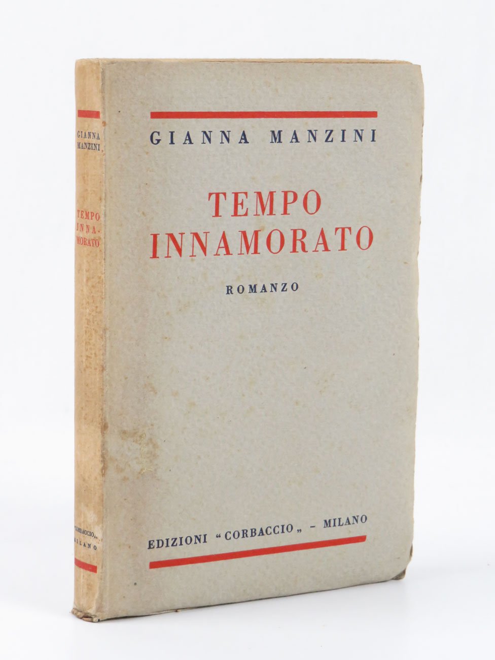 LIBROEdizione originale.Ottimo esemplare (dorso brunito). Come da firma di possesso, la copia dell’intellettuale siciliano Ignazio Domino (1888-1952), uno dei primi biografi di Marinetti («Marinetti svelato», s. d. ma 1910 o 1911) e per tutta la vita un cultore della poesia e un bibliofilo.Prima edizione, opera prima. «Concentrando l'attenzione narrativa non sugli eventi raccontati ma sulle ripercussioni che gli eventi provocano nella coscienza dei protagonisti, [l’autrice] costruisce una struttura a quadri isolati in cui la trama corale procede per sospensioni o ipotesi attraverso lo slittamento dei piani prospettici e una continua dislocazione del punto di vista. La fisica presenza nella storia dell'autore, che su quella storia criticamente riflette mentre scrive, assicura continuità a scene tra loro anche irrelate e comunque mai disposte in rigida sequenza cronologica. Accolto come una ventata di novità sulla scena letteraria italiana, il volume fu subito recensito dal giovane E. Montale e dall'ormai celebre E. Cecchi: se il primo dichiarava che [l’autrice] "ha già fatto molto e molto ancora può fare per il romanzo italiano" («La Fiera letteraria», 5 ag. 1928), il secondo osservava come la "tecnica complicata e un po' abbagliante" di Tempo innamorato sia tanto originale che leggendo "quasi mai vien da pensare ad altri autori" («Pegaso», I [1929], 1, pp. 95 s.)» (Ghilardi, «Manzini», voce del «Dizionario biografico degli Italiani», volume 69, 2007).