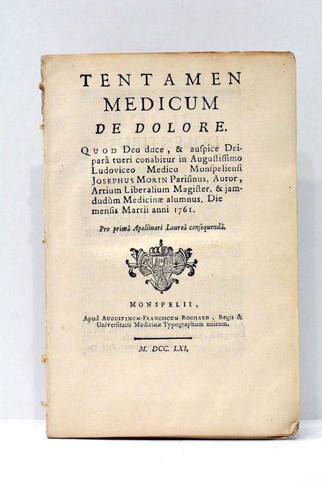 4 feuillets. 46 pages. 1 feuillet. (19x12,5 Cm). Dérelié. Publiée en 1761 à Montpellier, cette dissertation médicale de Joseph Morin explore le concept de la douleur sous un angle scientifique et philosophique. À une époque où la médecine commence à peine à se formaliser comme science, l'auteur s'interroge sur les causes de la douleur et les méthodes pour l'atténuer. Cet ouvrage, imprimé par Rochard, témoigne de l'intérêt grandissant pour une approche plus rationnelle et moins empirique de la médecine. Coupe irrégulière de la marge supèrieure. Quelques annotations dans le texte.