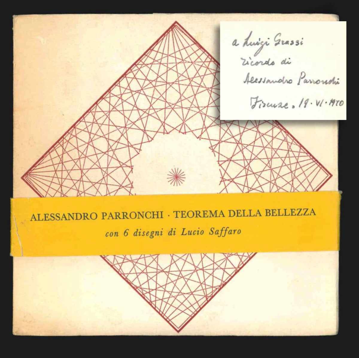 LIBROSeconda edizione.CON AUTOGRAFO.Esemplare 51 di 1000 numerati, completo della fascetta editoriale, in ottime condizioni («price clipped»; minime bruniture e abrasioni i piatti, pricnipio di fessurazione alla cerniera anteriore, fascetta riparata con nastro adesivo). Dedica autografa dell’autore: «A Luigi Grassi ricordo di Alessandro Parronchi [.] Firenze, 19 · VI · 1970».Volumetto edito in occasione della mostra personale di Lucio Saffaro a Trieste con tiratura di 1000 esemplari numerati.
